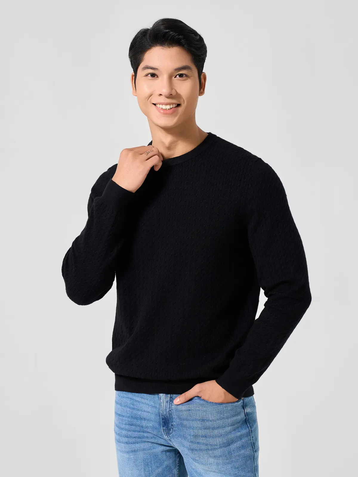 Áo len nam cổ tròn kết hợp quần jeans