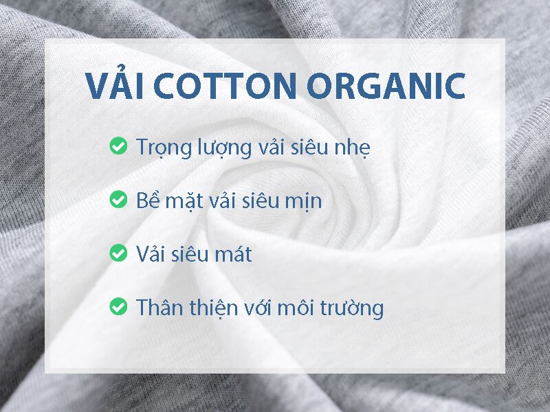 Được mệnh danh là loại vải thun cotton sạch nhất và cao cấp nhất hiện nay, sản xuất bằng nguyên liệu cotton tự nhiên, không sử dụng thuốc bảo vệ thực vật hay phân bón hóa học mà chỉ ưu tiên sử dụng phân bón được ủ từ thực vật hoặc phân động vật. Chất liệu này sẽ hoàn toàn đảm bảo sức khỏe người sử dụng và bảo vệ môi trường.