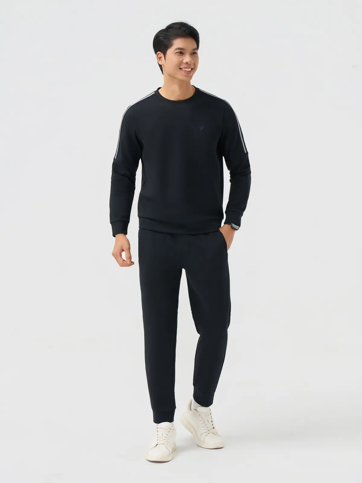 Cách thiết kế phối sọc, detail đường line chạy từ áo đến quần xuyên suốt một bộ đồ là một cách tạo hình rất phổ biến cho những bộ đồ thể thao. Bộ đồ thể thao cho nam nỉ phối sọc bao gồm quần jogger cùng một chiếc áo khoác và thường được làm từ chất liệu nỉ.