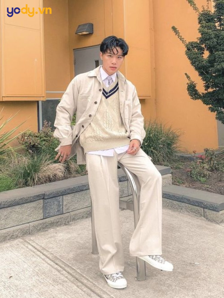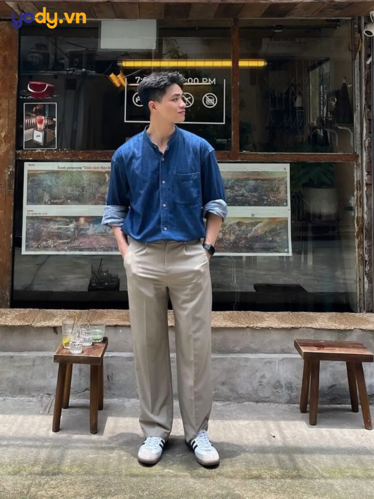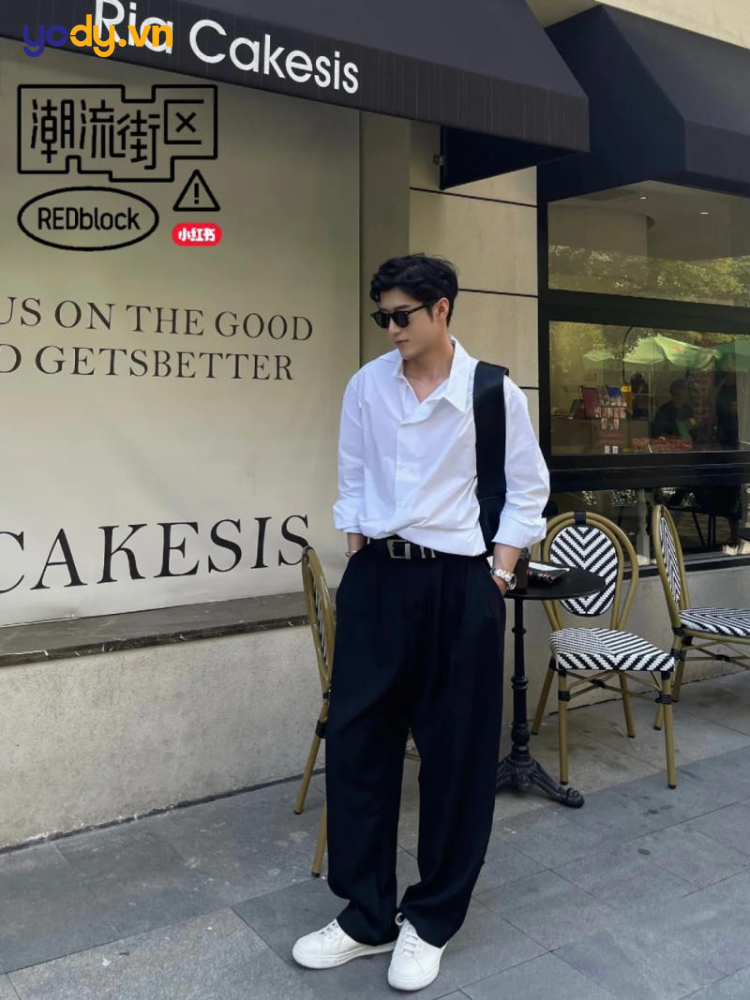 Quần âu ống rộng khi kết hợp cùng áo sơ mi trắng hoặc sơ mi Oxford form vừa sẽ tạo nên tổng thể cân đối, nam tính. Điểm mấu chốt nằm ở phom dáng: áo không quá ôm nhưng cũng không thùng thình. Sơ vin toàn bộ hoặc sơ vin nửa vạt giúp set đồ trông chỉn chu hơn, kết hợp cùng loafer hoặc sneaker trắng sẽ mang lại vẻ ngoài hiện đại, dễ ứng dụng từ đi làm đến gặp gỡ cuối tuần.