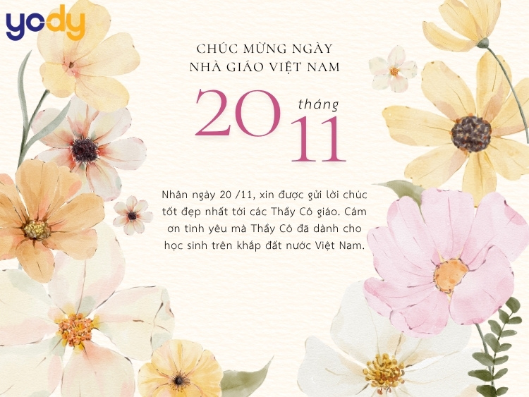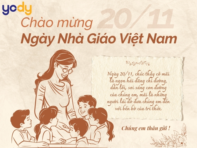 Ảnh 20/11 là cách tuyệt vời để thể hiện lòng tri ân sâu sắc đến những người thầy, người cô đã cống hiến thầm lặng trong sự nghiệp "trồng người". Bài viết của YODY tổng hợp hơn 55 mẫu ảnh chất lượng cao, từ những bức ảnh mang thông điệp chúc mừng trang trọng, hình ảnh hoạt động tri ân, đến những khoảnh khắc đẹp về tình thầy trò. Đây là nguồn tài liệu phong phú giúp bạn lựa chọn hình ảnh phù hợp nhất để gửi tặng, chia sẻ trên mạng xã hội, hoặc sử dụng trong các ấn phẩm kỷ niệm ngày trọng đại này.
