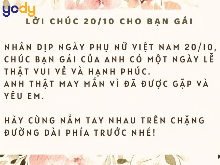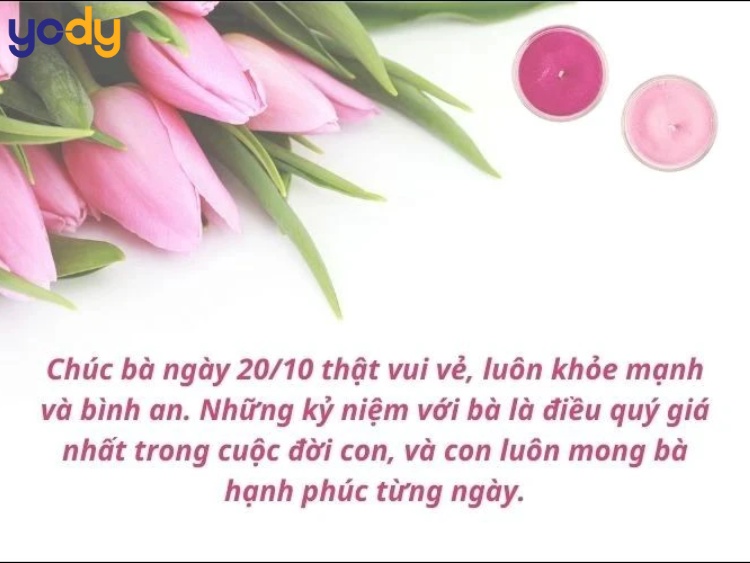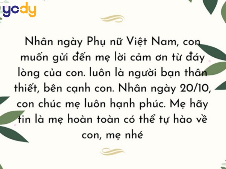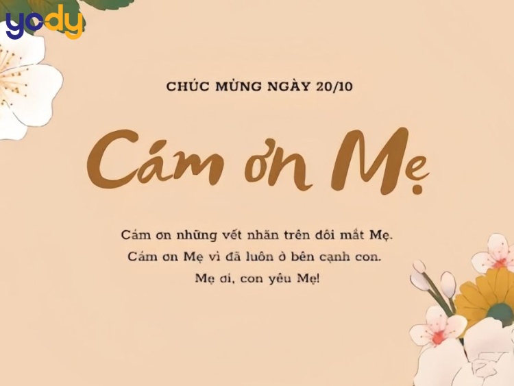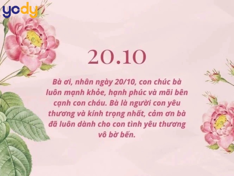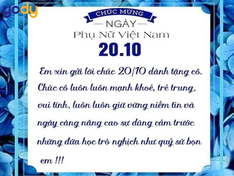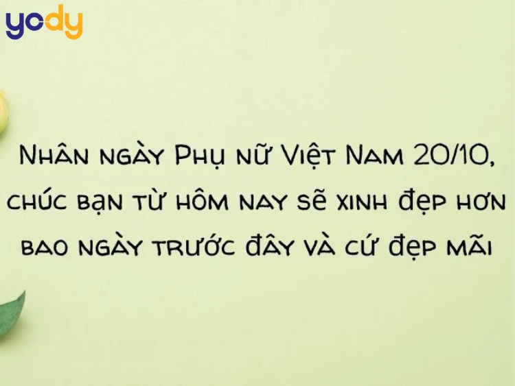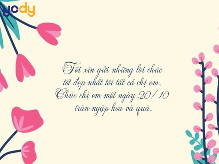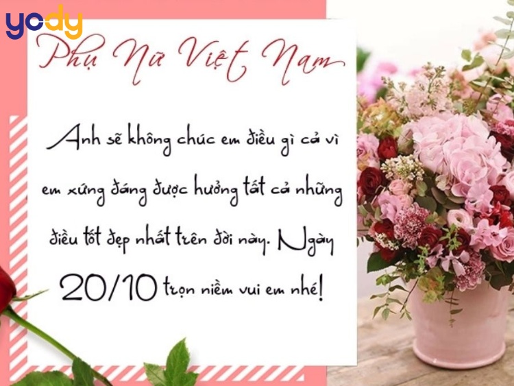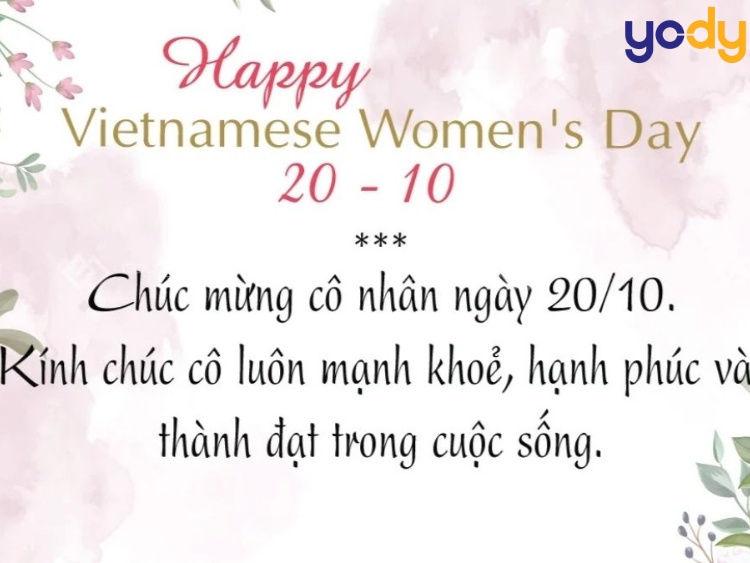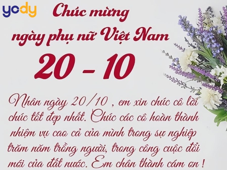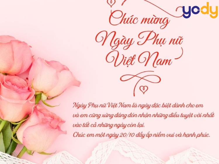 Ảnh chúc 20/10 đẹp và ý nghĩa là một cách tuyệt vời để bạn thể hiện sự tri ân và tình cảm sâu sắc đến những người phụ nữ quan trọng trong cuộc đời mình nhân dịp Ngày Phụ nữ Việt Nam. Bài viết này của YODY sẽ tổng hợp những hình ảnh chúc mừng ngày 20/10 đa dạng về phong cách, từ nhẹ nhàng tinh tế đến rực rỡ vui tươi, giúp bạn dễ dàng lựa chọn và gửi gắm những thông điệp yêu thương ý nghĩa nhất.