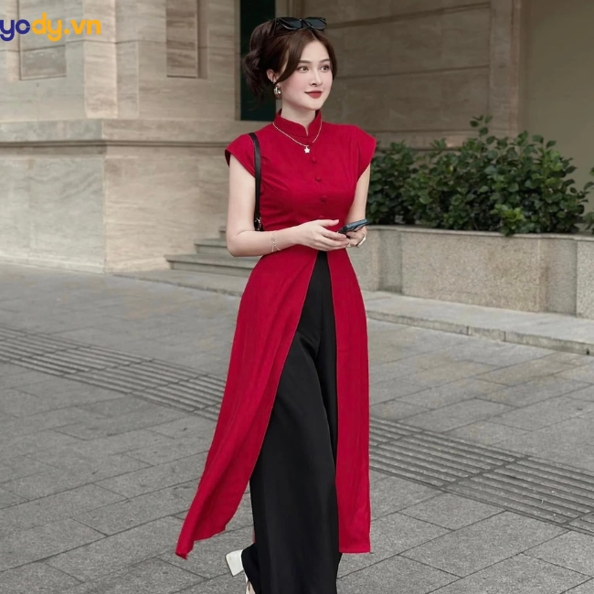 Kết hợp áo dài đỏ với quần đen là sự lựa chọn không bao giờ lỗi mốt. Màu đen huyền bí không chỉ tôn lên sắc đỏ nổi bật mà còn mang lại vẻ đẹp sang trọng, quý phái. Đây là bộ trang phục lý tưởng cho mọi hoàn cảnh, từ đi lễ chùa, thăm hỏi họ hàng đến tham gia các buổi tiệc trang trọng. Bạn có thể thêm phụ kiện như giày cao gót hoặc túi xách đồng màu để tăng thêm sự cuốn hút.