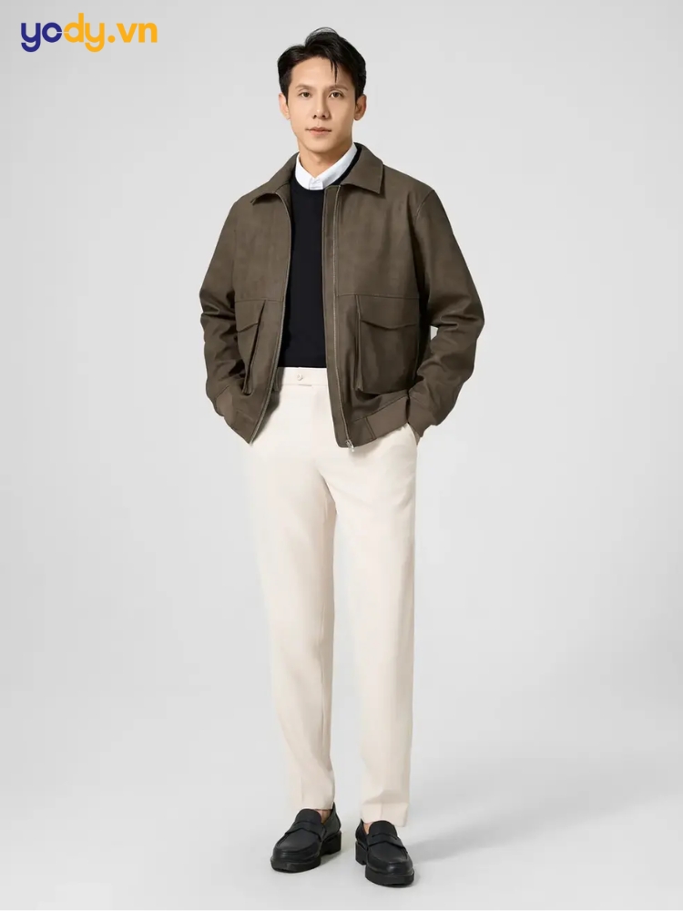 Áo bomber da kết hợp áo len cổ lọ cùng quần kaki, mang đến phong cách lịch lãm nhưng vẫn trẻ trung và năng động.