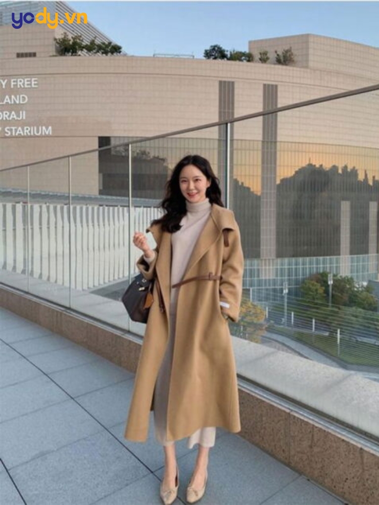Phong cách Hàn Quốc: Phối măng tô dáng dài với sweater cổ tròn, quần vải suông và sneaker trắng hoặc loafers. Ưu tiên màu trung tính như kem, be, pastel để tạo cảm giác nhẹ nhàng, tinh tế và gọn gàng.