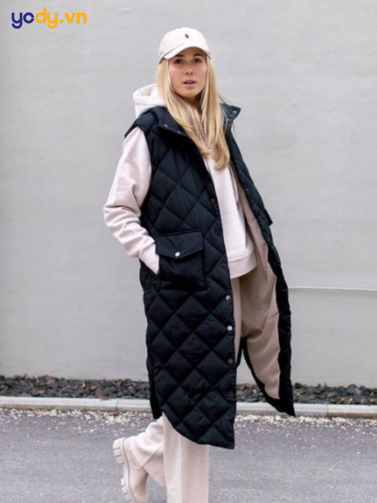 Công thức này đặc biệt phù hợp với những ai yêu thích phong cách thể thao, năng động. Phần áo hoodie hoặc áo nỉ bên trong giúp outfit thêm trẻ trung, trong khi áo phao gile dáng dài đóng vai trò điểm nhấn chính, tạo cảm giác khỏe khoắn và hiện đại. Set đồ này rất lý tưởng để đi chơi, dạo phố hay du lịch mùa lạnh.