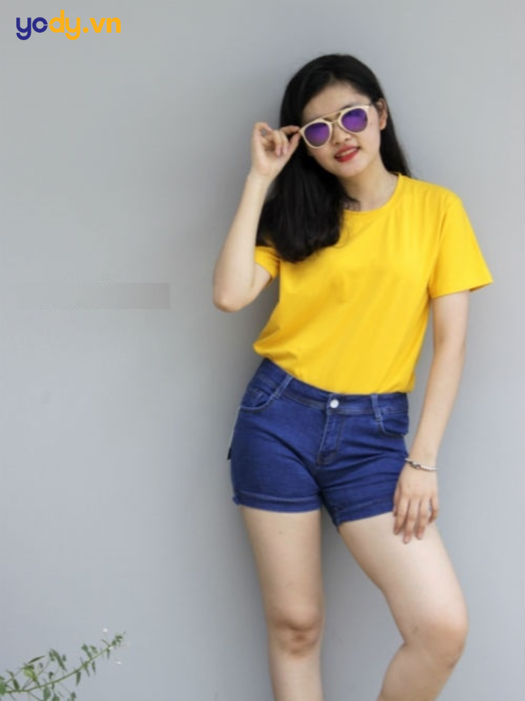 Nhắc đến phong cách mùa hè năng động, chắc chắn không thể bỏ qua sự kết hợp giữa áo thun vàng và quần short denim xanh. Màu xanh denim giúp cân bằng độ nổi bật của sắc vàng, tạo nên tổng thể hài hòa và dễ nhìn hơn. Set đồ này mang đến vẻ ngoài trẻ trung, khỏe khoắn và cực kỳ thoải mái, rất phù hợp cho những chuyến du lịch biển, dạo phố hoặc các hoạt động ngoài trời.