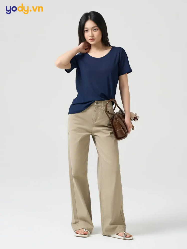 Nếu muốn tạo nên vẻ ngoài ấm áp và tinh tế, hãy thử kết hợp áo thun xanh đen với quần màu be hoặc nâu. Sự hòa trộn giữa gam màu trầm và tông đất tạo nên tổng thể trang phục mang hơi hướng cổ điển, sang trọng. Đây là lựa chọn lý tưởng cho phong cách smart-casual, rất phù hợp khi đi làm, gặp gỡ đối tác hoặc những buổi hẹn hò cần sự lịch sự nhưng không quá trang trọng.