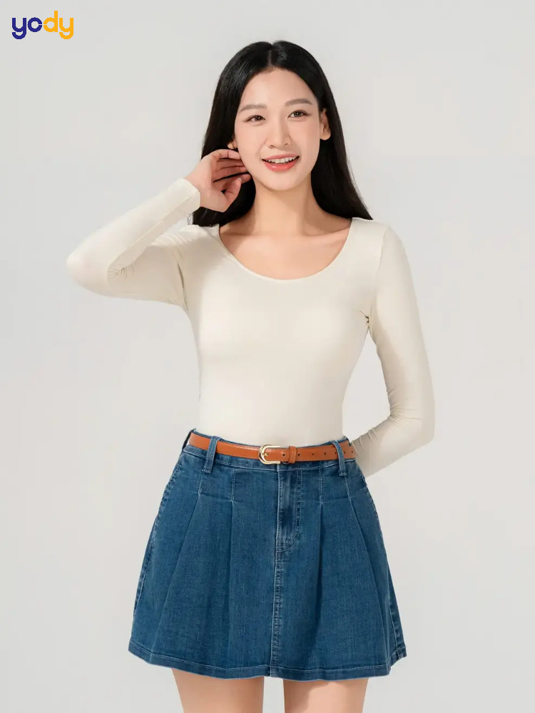 Áo cổ tròn phối cùng chân váy mang lại vẻ ngoài nữ tính và thanh lịch. Chân váy chữ A giúp tôn dáng, phù hợp với nhiều vóc dáng khác nhau. Chân váy midi hoặc chân váy xếp ly kết hợp áo cổ tròn tạo cảm giác nhẹ nhàng, duyên dáng. Có thể sơ vin hoặc buộc vạt áo nhẹ để tạo điểm nhấn cho trang phục.