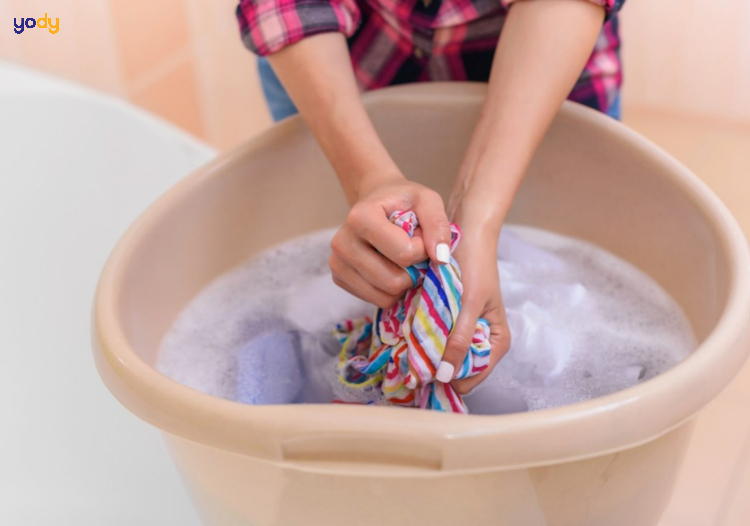 Vò nhẹ nhàng, tập trung vào vết bẩn: Nhấn nhẹ vùng cổ áo, nách hoặc các khu vực bám bẩn. Không chà xát mạnh, tránh kéo căng vải làm áo mất form. Bạn có thể dùng tay nhào nhẹ theo chuyển động tròn để làm sạch vết bẩn hiệu quả mà không gây hư hại.