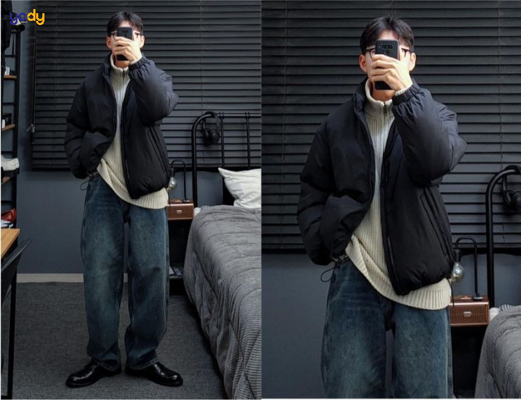 Một trong những cách phối đồ kinh điển với áo khoác lông vũ chính là kết hợp cùng áo len cổ cao. Sự dày dặn, ấm áp của áo len cùng khả năng giữ nhiệt vượt trội của áo lông vũ tạo nên bộ đôi hoàn hảo cho mùa đông. Outfit này không chỉ giúp bạn bảo vệ cơ thể khỏi gió lạnh mà còn mang lại vẻ ngoài lịch lãm, trưởng thành và đầy nam tính. Đặc biệt, nếu chọn áo len cổ cao màu trung tính như đen, trắng, xám hay be, bạn có thể dễ dàng phối hợp với nhiều dáng áo lông vũ khác nhau, từ dáng ngắn trẻ trung đến dáng dài sang trọng. Đây là set đồ phù hợp cả khi đi làm, gặp gỡ đối tác hay đi chơi cuối tuần.