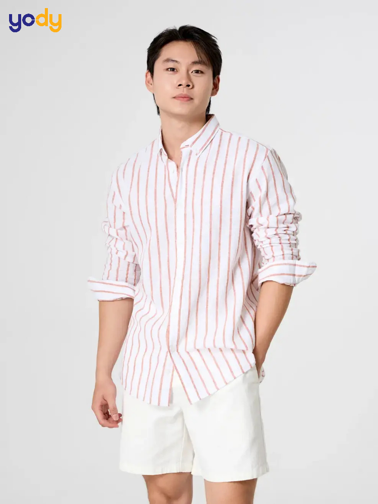 Họa tiết kẻ sọc dọc là "vũ khí" bí mật giúp các chàng trai trông cao ráo và thon gọn hơn. Khi kết hợp cùng quần Short màu kem (beige), set đồ tạo nên một dải màu hài hòa, thanh lịch và rất dịu mắt dưới ánh nắng mặt trời.