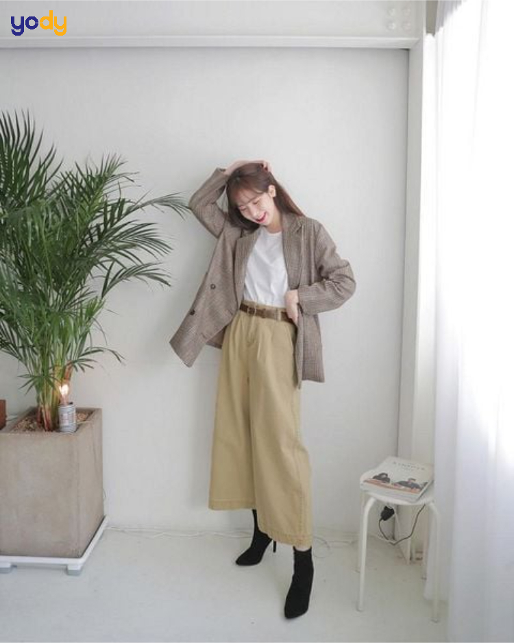 Một lựa chọn đầy tính ứng dụng cho môi trường công sở. Áo sơ mi thanh lịch, quần culottes rộng rãi mang lại sự thoải mái, và áo khoác dáng dài giúp tổng thể trở nên chuyên nghiệp, hiện đại. Mẹo nhỏ: hãy chọn áo sơ mi màu trắng hoặc pastel, quần culottes tông trầm, và khoác ngoài một chiếc blazer dáng dài hoặc trench coat. Kết hợp cùng giày loafer hoặc giày bít mũi thấp để vừa thuận tiện di chuyển vừa giữ được phong thái thanh lịch.
