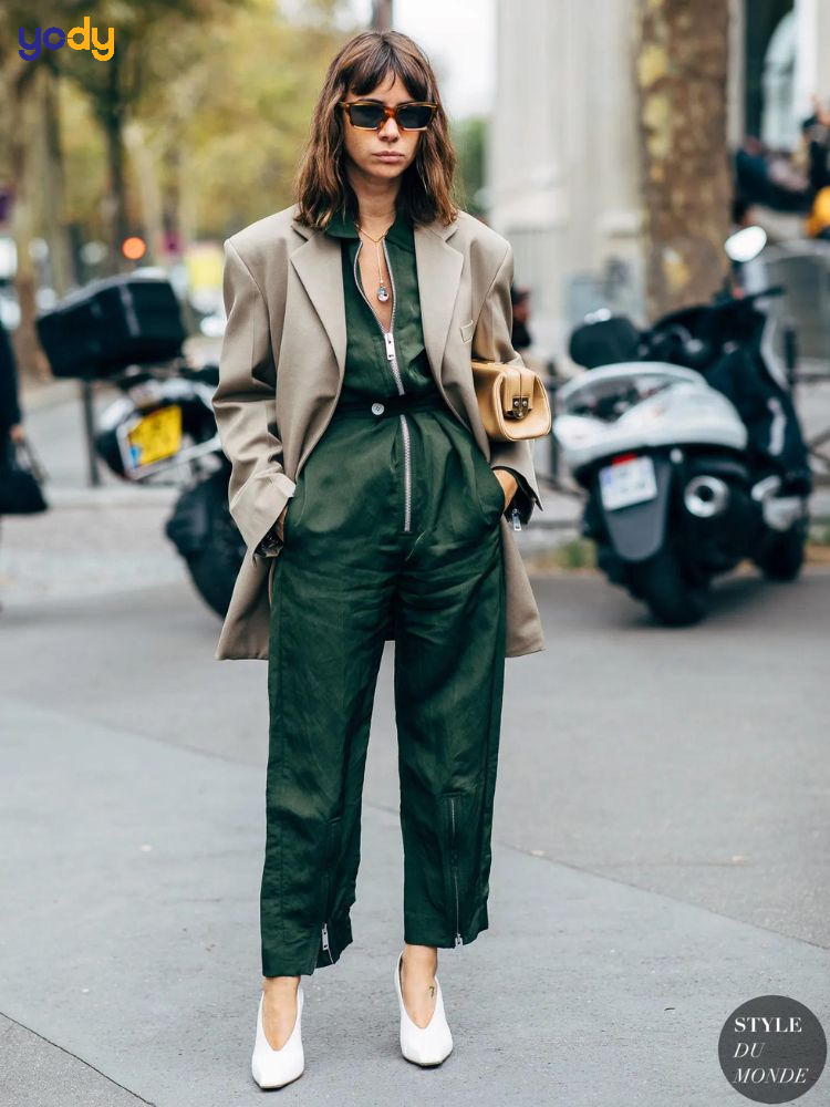 Một lựa chọn độc đáo, cá tính dành cho những cô nàng yêu thích sự mới mẻ. Jumpsuit gọn gàng, tiện lợi, khi kết hợp với áo khoác dáng dài sẽ tạo sự tương phản thú vị về kiểu dáng. Nên chọn jumpsuit màu trơn, kết hợp với trench coat hoặc áo khoác phao dáng dài. Một đôi giày sneaker hoặc boots cổ thấp sẽ giúp bạn vừa ấm vừa phong cách.