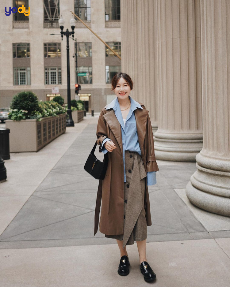 Áo trench coat dáng dài – Lấy cảm hứng từ phong cách quân đội Anh cổ điển nhưng đã được biến tấu để trở nên nữ tính và hiện đại hơn. Trench coat thường làm từ vải gabardine hoặc cotton pha polyester có khả năng chống thấm nhẹ, rất thích hợp cho thời tiết mưa phùn hoặc se lạnh đầu đông. Thiết kế đặc trưng gồm hàng khuy đôi, đai thắt eo và cầu vai, tạo cảm giác thanh lịch và gọn gàng. Đây là item lý tưởng để layer cùng áo len cổ lọ, chân váy midi hoặc quần jeans skinny. Chỉ cần thêm một đôi ankle boots là bạn đã có ngay set đồ đậm chất Parisian chic.