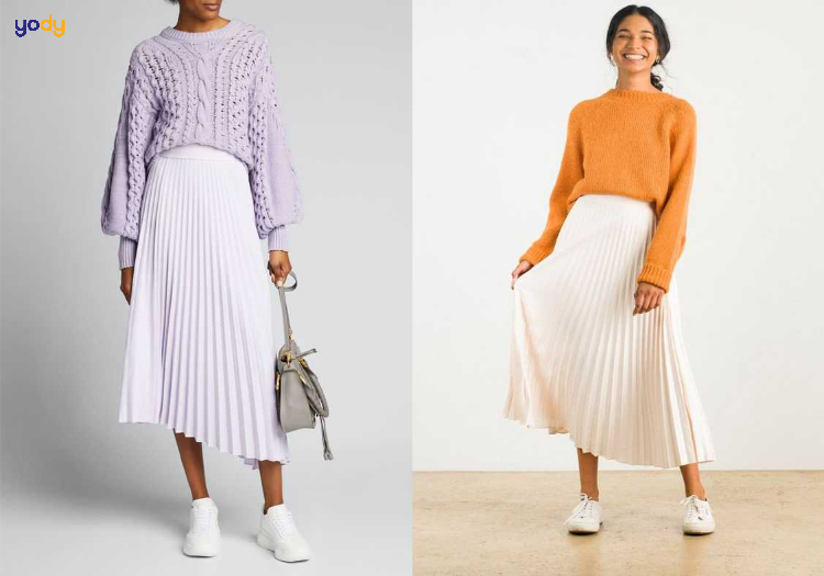 3.7. Kết hợp sweater với chân váy dài xếp ly