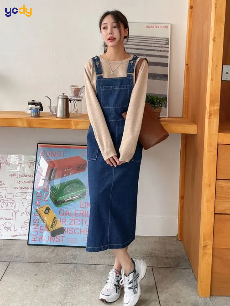Một cách phối đồ độc đáo khác là mặc sweater bên trong váy yếm hoặc jumpsuit. Sự kết hợp này tạo hiệu ứng layer đáng yêu, trẻ trung và phù hợp cho cả môi trường học tập lẫn dạo chơi. Chọn sweater có cổ cao hoặc cổ tròn đơn giản để không gây rối mắt. Bạn có thể mang thêm khăn quàng mỏng hoặc mũ beret để tăng tính thời trang.