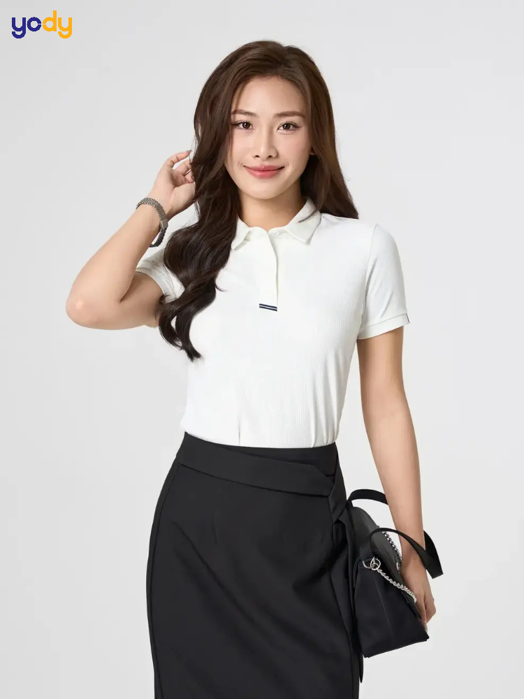 Đây là cách phối đồ công sở kinh điển, phù hợp với hầu hết môi trường làm việc từ truyền thống đến hiện đại. Áo sơ mi trắng mang lại cảm giác sạch sẽ, chỉn chu, trong khi quần tây đen giúp tổng thể trông gọn gàng và chuyên nghiệp hơn.
