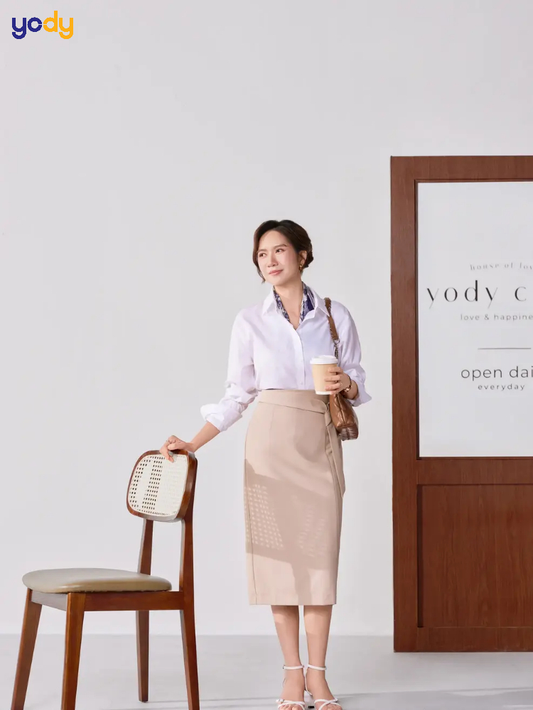 Áo blouse trơn giúp tổng thể trang phục trông mềm mại và thanh lịch hơn, trong khi chân váy bút chì tôn dáng và tạo cảm giác chuyên nghiệp. Sự kết hợp này rất phổ biến trong môi trường công sở dành cho nữ.