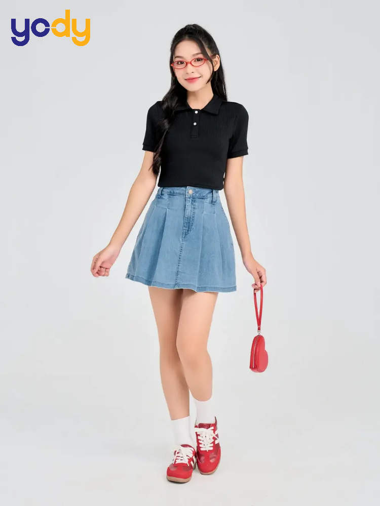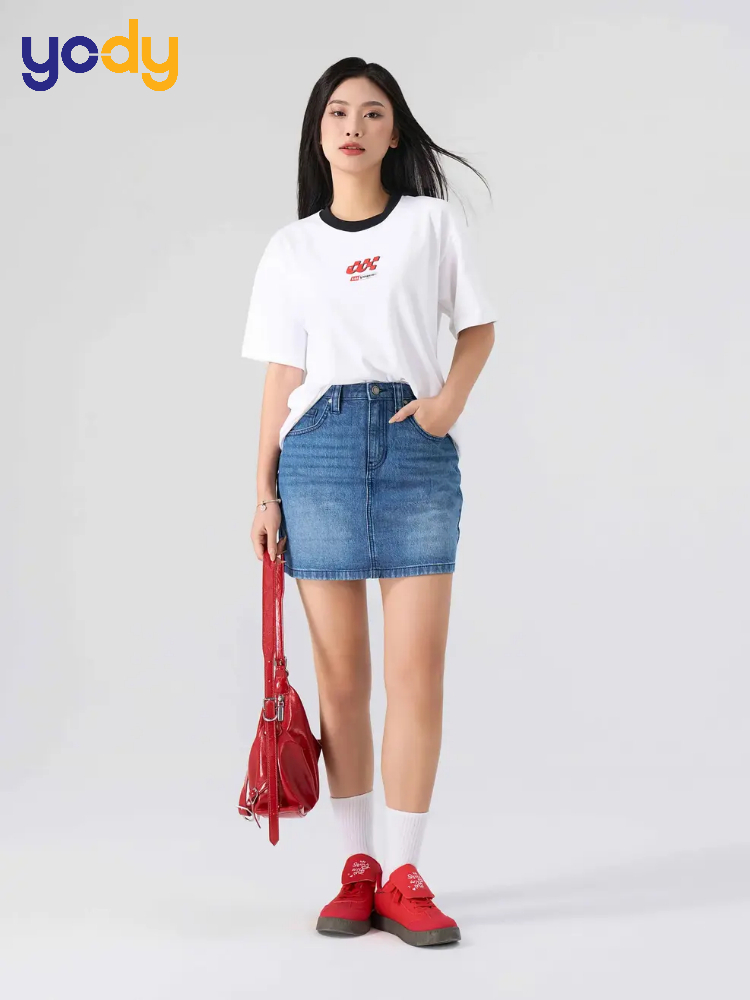 Áo thun basic luôn là lựa chọn hàng đầu cho những cô nàng yêu thích sự đơn giản và năng động. Khi kết hợp cùng chân váy jean dài xòe, bộ trang phục tạo nên một vẻ ngoài trẻ trung, phù hợp cho những buổi dạo phố, đi học hay gặp gỡ bạn bè. Để set đồ không bị luộm thuộm, bạn nên ưu tiên các mẫu áo thun có độ ôm vừa phải và đừng quên sơ vin gọn gàng để tạo hiệu ứng đôi chân dài miên man.