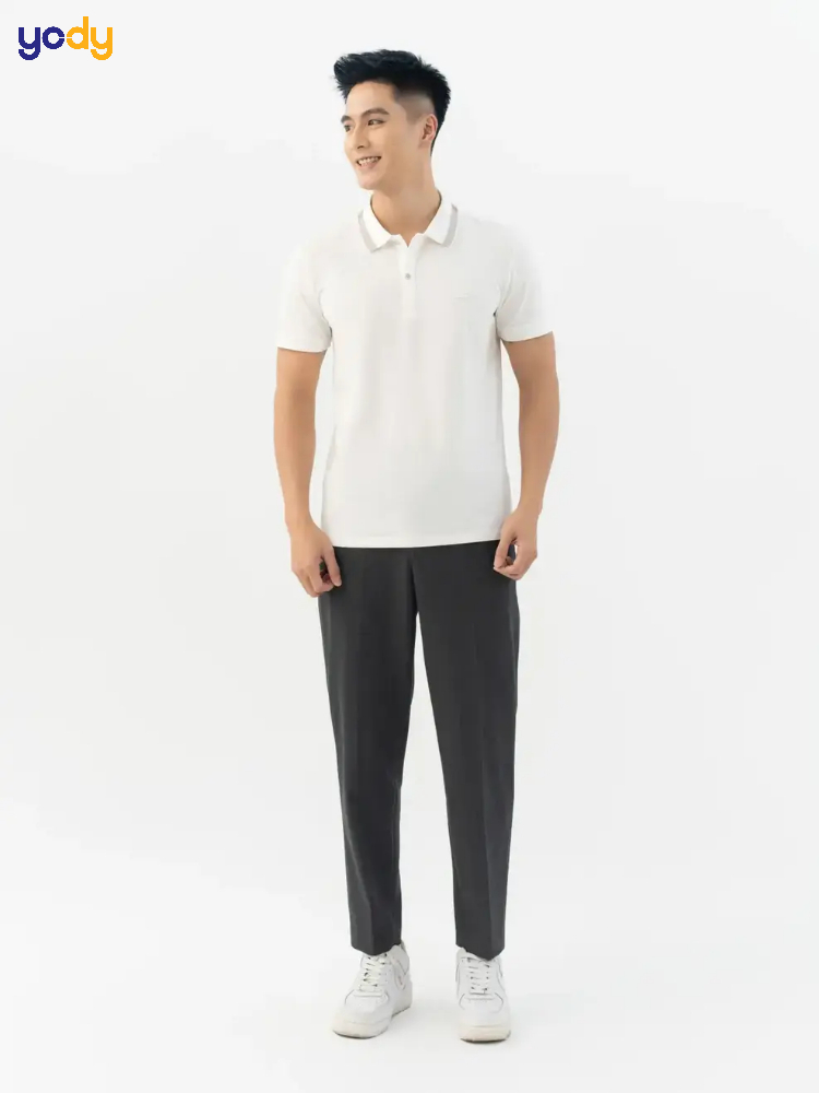 Quần âu đen có khả năng “giấu khuyết điểm” tốt, giúp vóc dáng trông cao ráo và thon gọn hơn. Trong khi đó, áo polo trắng mang lại cảm giác sáng sủa, lịch sự nhưng không quá cứng nhắc như áo sơ mi.