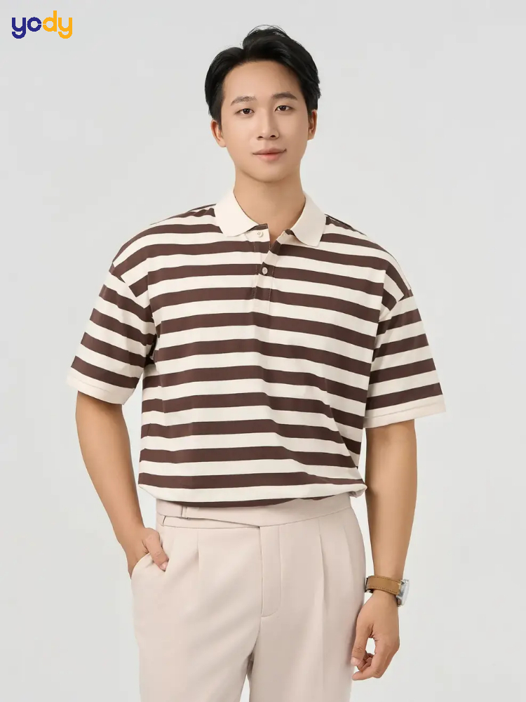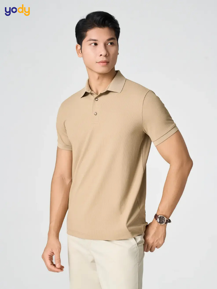Áo polo màu be làm dịu tổng thể, tạo sự cân bằng và nhẹ nhàng. Sự kết hợp này giúp người mặc trông chững chạc nhưng vẫn thân thiện.