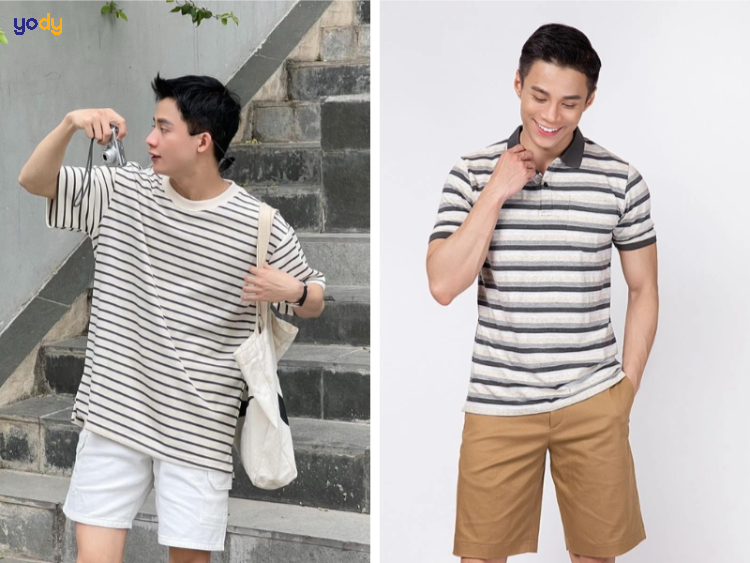 Set đồ này tuy đơn giản nhưng không hề “nhạt nhòa” đâu nhé! Áo thun sọc ngang giúp phần thân trên trông đầy đặn hơn, đặc biệt hợp với những bạn có vóc dáng mảnh mai. Khi phối cùng quần short trơn màu như đen, be hoặc xanh navy, bạn sẽ có được outfit hài hòa, dễ mặc và dễ phối thêm phụ kiện. Phong cách này hợp với cả bạn nam và bạn nữ yêu thích sự năng động, thoải mái mà vẫn nổi bật.