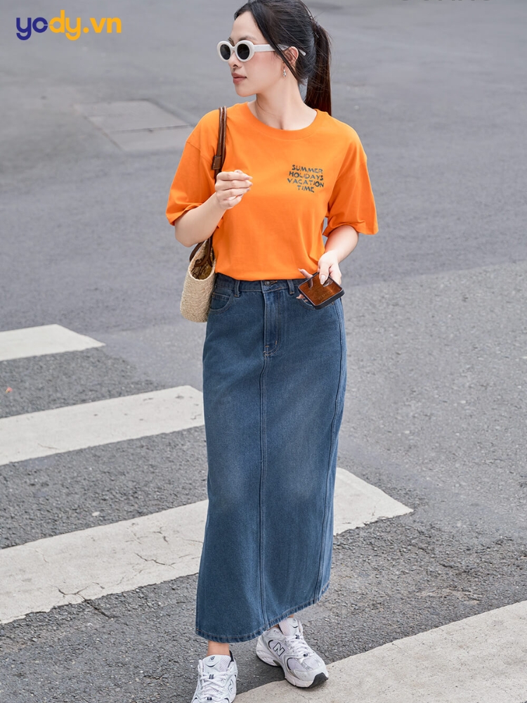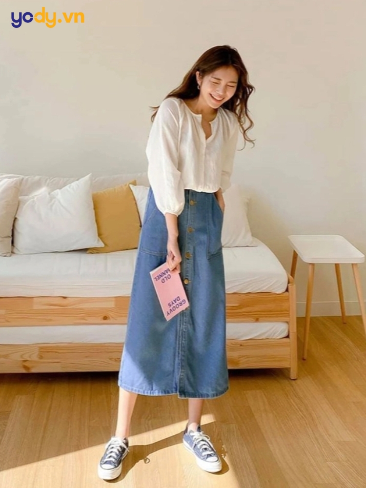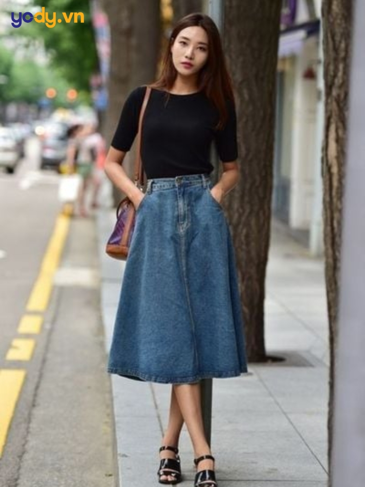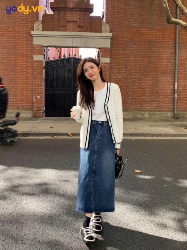 Chân váy lỡ: Với độ dài ngang gối hoặc giữa bắp chân, midi jean là lựa chọn hoàn hảo cho vẻ đẹp thanh lịch, thời thượng. Không quá ngắn cũng không quá dài, chân váy midi đủ kín đáo cho môi trường công sở và đủ linh hoạt cho các buổi hẹn hò. Khi phối cùng giày cao gót hoặc sneaker trắng, bạn sẽ có ngay set đồ vừa sang vừa hiện đại.