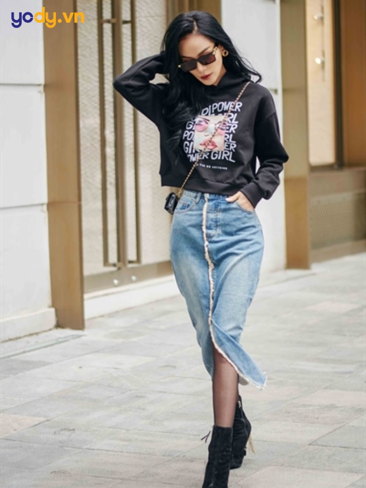 Mang tinh thần "sporty chic", bản phối giữa áo hoodie/sweater và chân váy jean là tuyên ngôn của sự thoải mái và cá tính. Đây là set đồ hoàn hảo cho những ngày cuối tuần năng động.