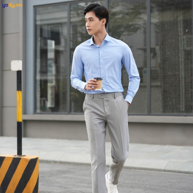 Được mệnh danh là công thức bất bại dành cho các chàng trai yêu thích sự lịch lãm, chỉn chu. Bạn có thể chọn áo sơ mi trắng, xanh nhạt hoặc họa tiết caro, kẻ sọc. Kết hợp cùng quần tây ống đứng và một đôi giày tây sẽ giúp bạn trông thật bảnh bao và cuốn hút.