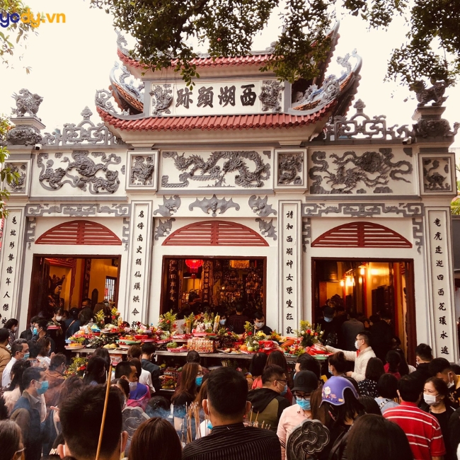 Nằm yên bình trên bán đảo ven Hồ Tây lộng gió, Phủ Tây Hồ là nơi thờ Mẫu Liễu Hạnh - một trong Tứ bất tử trong tín ngưỡng dân gian Việt Nam. Không chỉ là nơi dâng hương cầu tài lộc, may mắn, sức khỏe, Phủ Tây Hồ còn thu hút du khách bởi cảnh quan tuyệt đẹp. Hồ nước mênh mông, cây cối xanh mát, không khí trong lành tạo nên một khung cảnh thanh tịnh, giúp tâm hồn bạn thư thái sau những ngày bận rộn. Nếu mùng 1 Tết đi đâu chơi là điều bạn đang băn khoăn thì Phủ Tây Hồ chính là gợi ý cực hấp dẫn không nên bỏ lỡ dịp đầu năm.