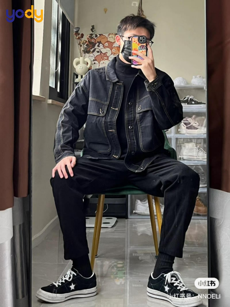 Phong cách All-Black với áo khoác jean đen, áo thun đen và quần đen là lựa chọn hàng đầu cho những chàng trai yêu thích sự tối giản và quyền lực. Sự đồng nhất về màu sắc giúp người mặc trông thon gọn, chuyên nghiệp và có chút bí ẩn.