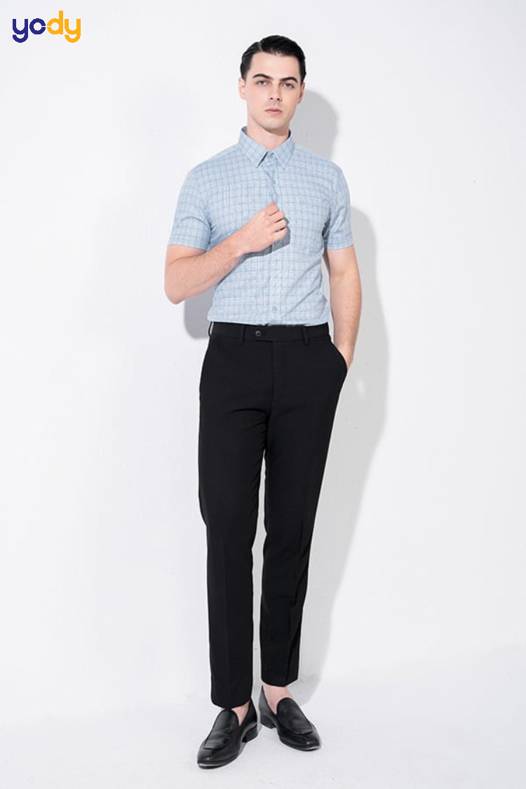 Nếu bạn muốn tạo sự mới mẻ trong phong cách công sở, hãy thử phối sơ mi co giãn có họa tiết nhỏ như caro mảnh, chấm bi hoặc kẻ sọc nhẹ với quần âu màu đen hoặc xanh đậm. Set đồ này vừa giữ được vẻ nghiêm túc cần thiết, vừa tránh sự đơn điệu. Thích hợp cho các buổi họp nhẹ nhàng, gặp gỡ đối tác trẻ hoặc làm việc trong môi trường sáng tạo. Đi kèm với giày loafer hoặc oxford sẽ càng thêm lịch lãm.