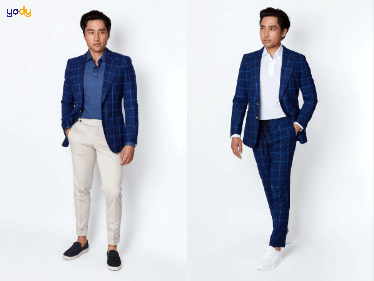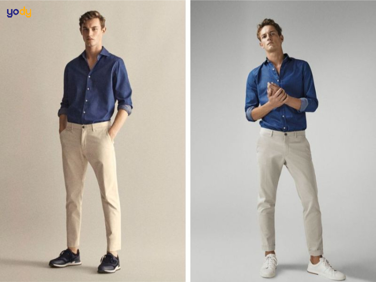 Nếu bạn muốn tạo hình ảnh lịch lãm nhưng vẫn trẻ trung, combo này là lựa chọn lý tưởng. Áo sơ mi xanh navy vừa sang trọng vừa dễ phối, khi đi cùng quần âu xám sáng và blazer cùng tông hoặc màu đậm hơn sẽ mang lại vẻ ngoài hiện đại, phù hợp với các buổi tiệc cưới hoặc gala tối.