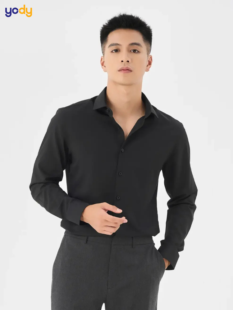 Sơ mi đen mang lại nét bí ẩn và mạnh mẽ. Khi phối cùng quần âu xám khói và điểm nhấn bằng một chiếc đồng hồ dây kim loại sáng màu, tổng thể trang phục sẽ trở nên tinh tế và cuốn hút. Set đồ này đặc biệt phù hợp cho những buổi tiệc có dress code tối giản nhưng sang trọng.