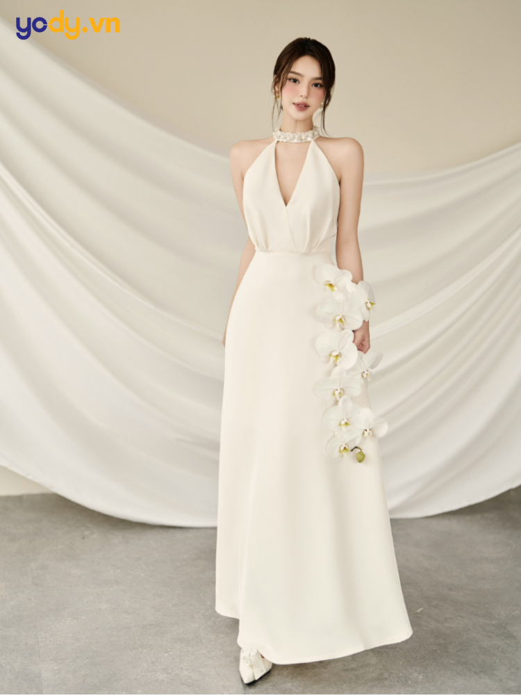 Thiết kế cổ yếm tinh tế giúp khoe khéo bờ vai và xương quai xanh, trong khi dáng midi giữ được sự nền nã cần thiết ngày Tết. Đầm lụa đặc biệt phù hợp cho các buổi gặp gỡ thân mật, tiệc nhẹ buổi tối hoặc chúc Tết gia đình bên ngoại.