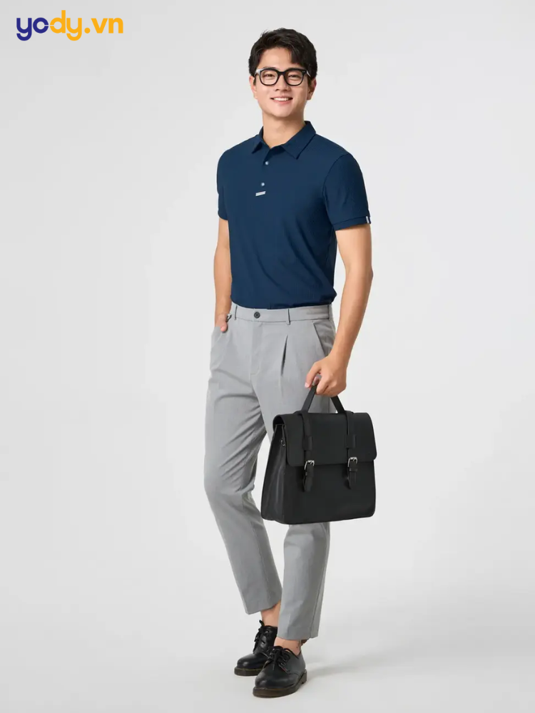 Phong cách Old Money: Áo polo dệt kim (knit polo) kết hợp quần âu xếp ly là công thức chuẩn chỉnh cho quý ông theo đuổi phong cách tinh tế, có chiều sâu. Thêm thắt lưng da bản vừa và giày da mũi tròn sẽ giúp tổng thể toát lên sự điềm đạm, sang trọng nhưng không hề cứng nhắc.