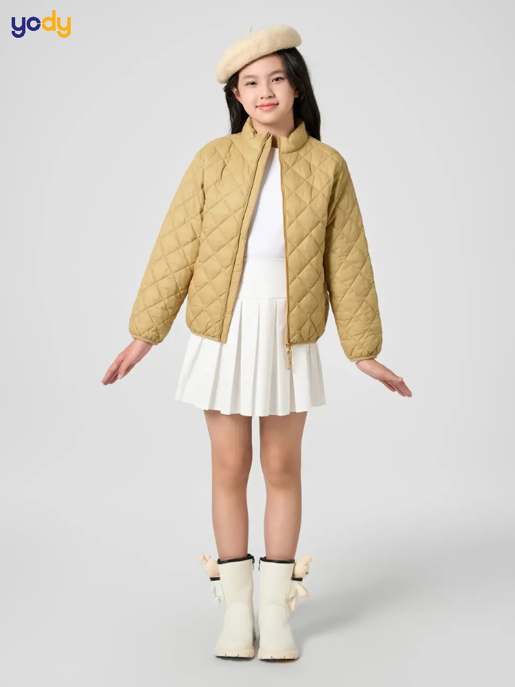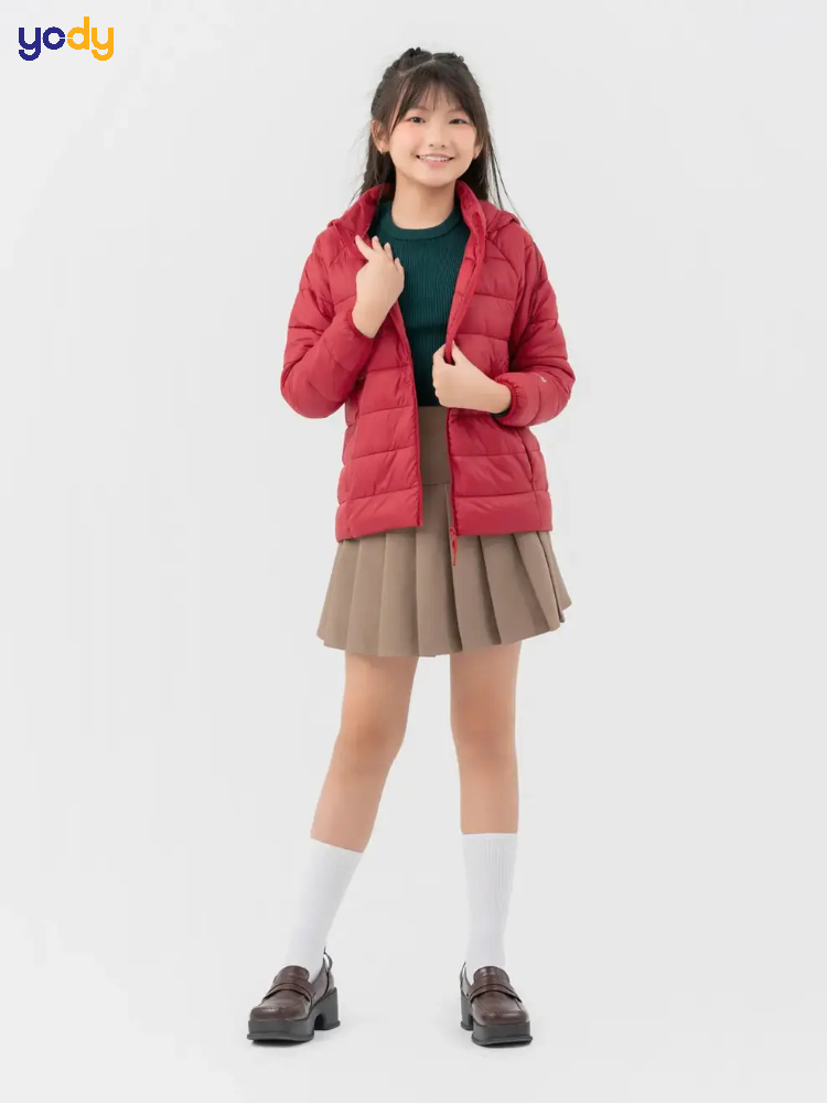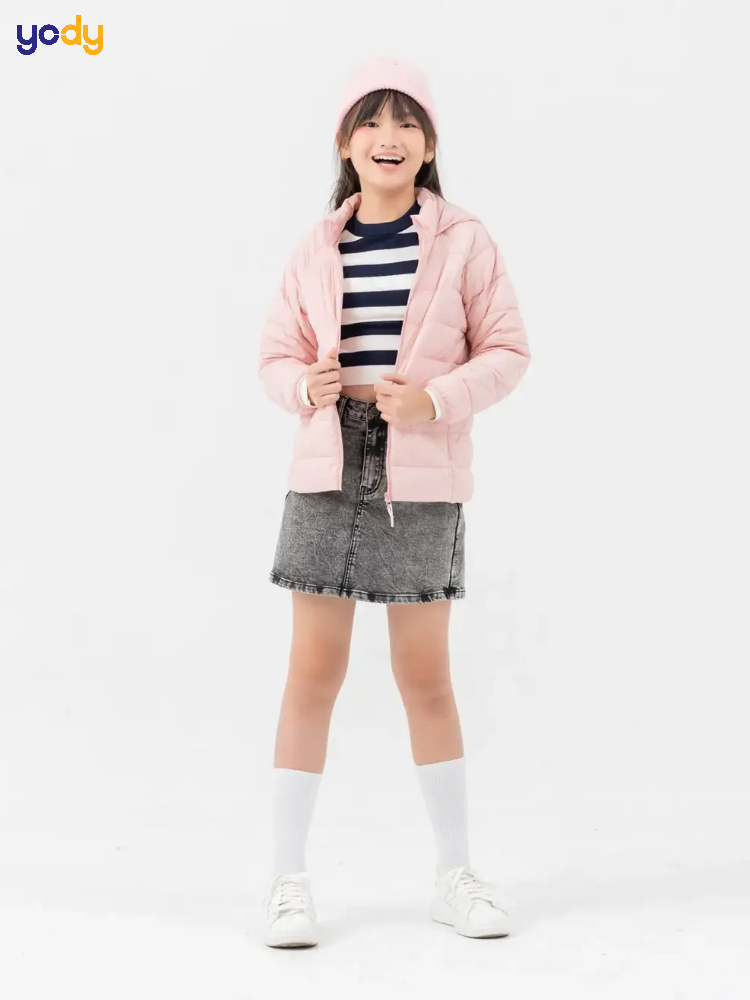 Chân váy dày giúp giữ ấm tốt hơn so với váy mùa hè, đặc biệt khi kết hợp với legging hoặc tất len. Khi phối cùng áo phao, bé gái trông vô cùng đáng yêu, nữ tính và nổi bật. Đây là outfit thích hợp cho bé diện đi tiệc, đi chơi hoặc chụp ảnh.