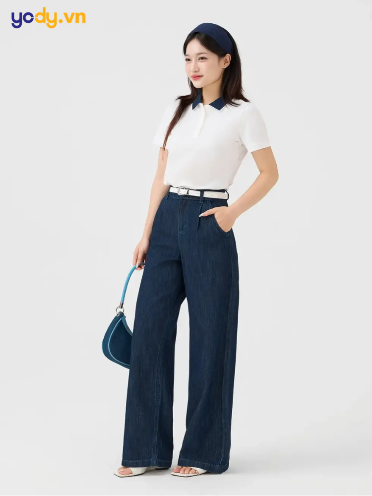 Quần jean: Áo polo dáng ôm sơ vin cùng quần jean cạp cao, ống suông hoặc ống loe tạo nên vẻ ngoài vừa bụi bặm vừa quyến rũ. Đây là combo không bao giờ lỗi mốt, phù hợp với nhiều hoàn cảnh.