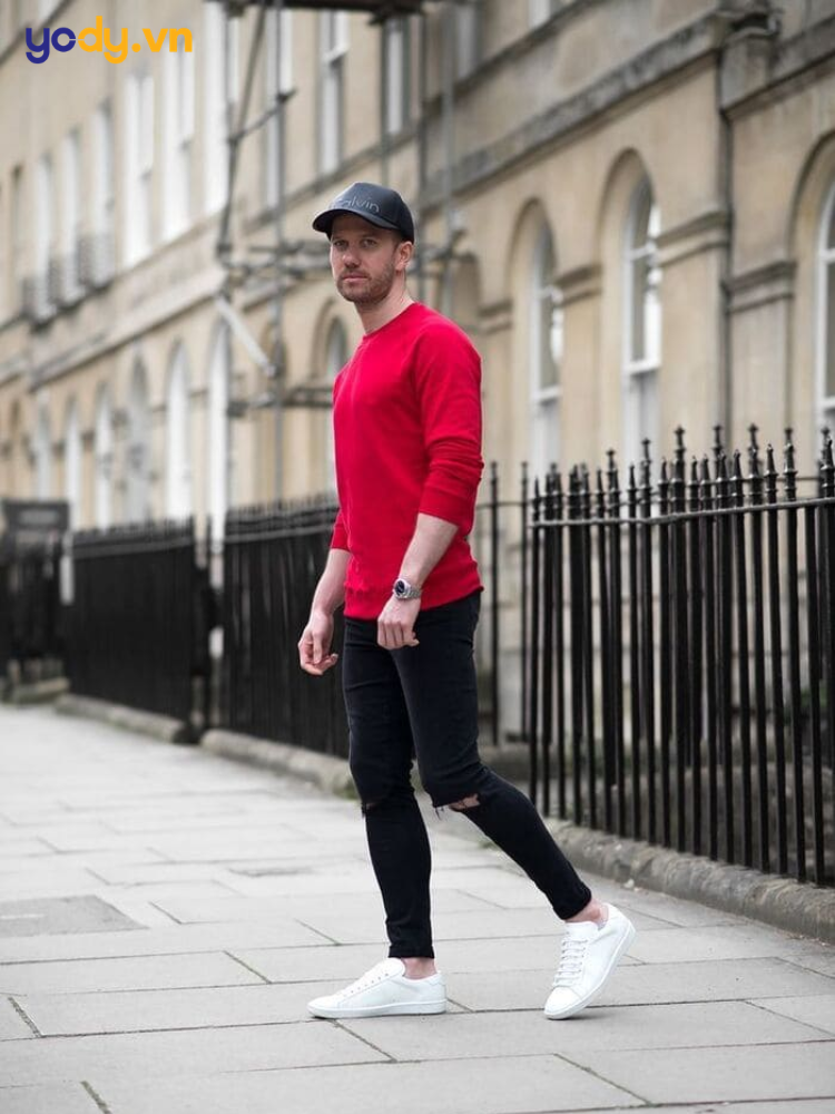 Áo thun đỏ khi kết hợp cùng quần jeans đen rách gối tạo nên hiệu ứng tương phản mạnh mẽ, mang đến vẻ ngoài nam tính và đậm chất streetwear. Một chiếc jeans đen slim-fit đi cùng sneaker trắng hoặc boots da cổ cao sẽ giúp tổng thể trang phục trông cực kỳ phong trần và thu hút khi dạo phố.