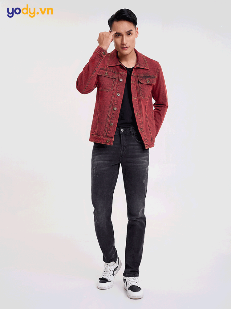 Một cách phối cực “ngầu” khác là mặc áo thun đỏ bên trong áo khoác denim hoặc bomber. Lớp áo khoác bên ngoài giúp giảm độ chói của màu đỏ và tạo chiều sâu cho trang phục. Kết hợp cùng quần jeans hoặc chinos tối màu sẽ giúp bạn có ngay một outfit vừa hiện đại vừa cá tính.