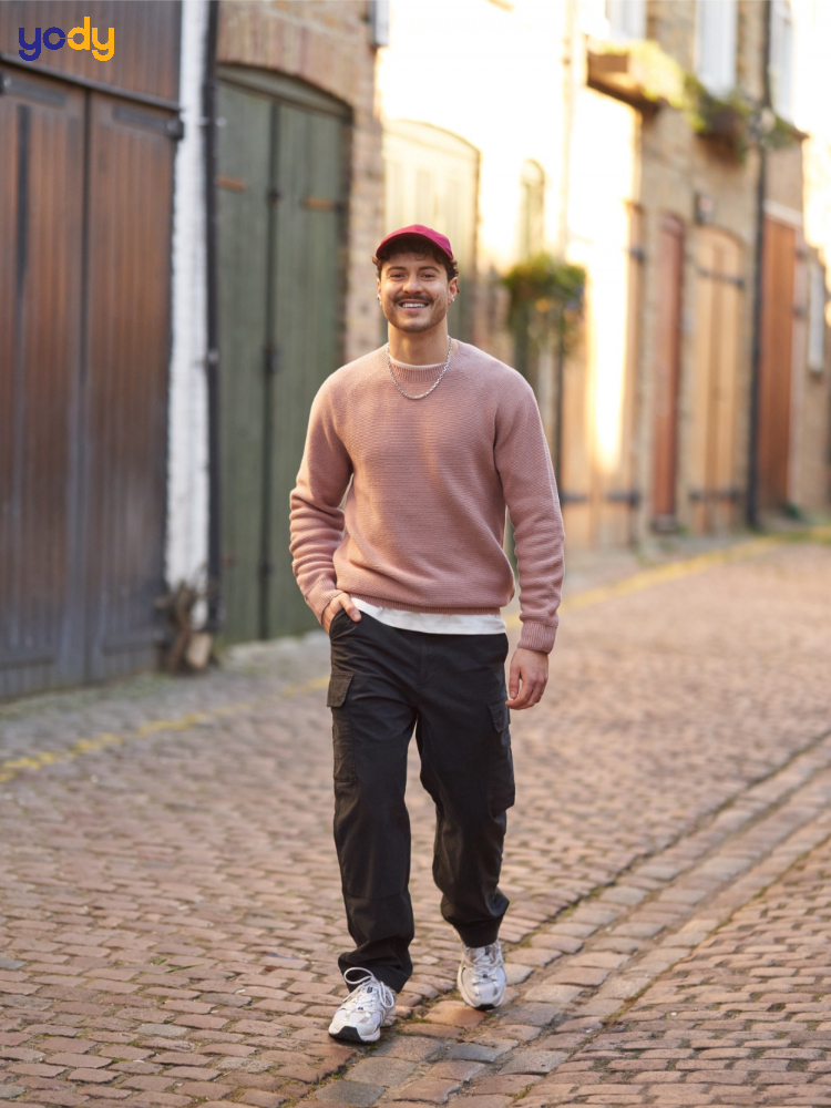 Vào những ngày trời lạnh, phối quần túi hộp với áo sweater basic sẽ mang lại cảm giác ấm áp mà vẫn cực kỳ thời trang. Sweater màu trơn như xám nhạt, nâu đất hay kem rất dễ kết hợp với các mẫu quần túi hộp tối màu. Kiểu phối này tạo sự mềm mại cho phần thân trên, trong khi phần thân dưới vẫn giữ được vẻ nam tính, khỏe khoắn. Đừng quên kết hợp với một đôi giày sneaker da hoặc giày boot thấp cổ để hoàn thiện set đồ.