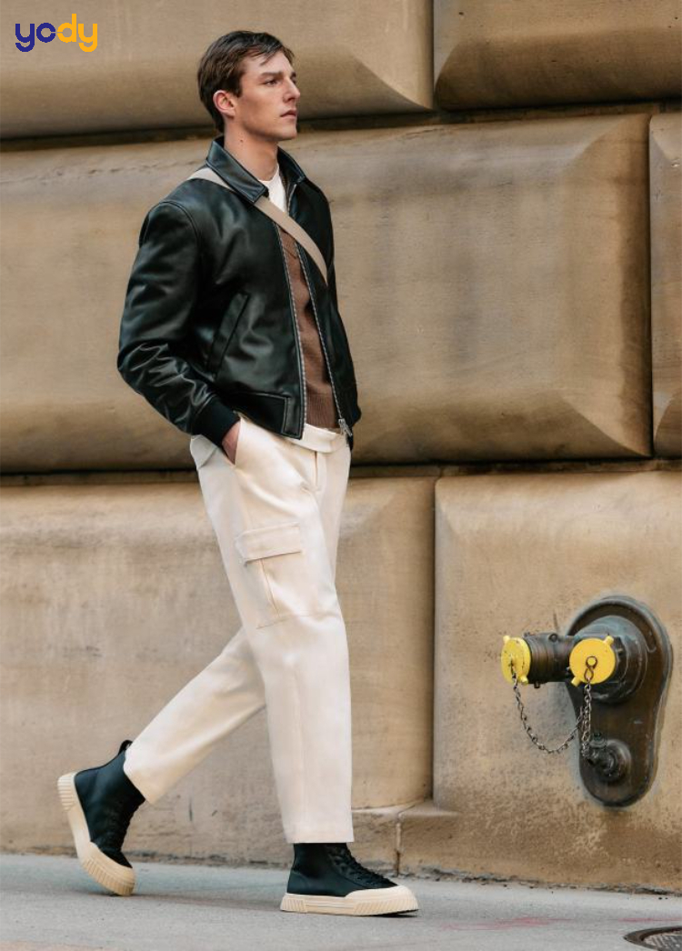 Nếu bạn là fan của phong cách thời trang nam tính, khỏe khoắn thì không nên bỏ qua cách phối quần túi hộp với áo khoác bomber. Bomber jacket giúp tạo điểm nhấn ở phần thân trên, trong khi quần túi hộp lại làm nổi bật phần thân dưới. Cặp đôi này tạo nên sự cân đối hoàn hảo, vừa tôn dáng vừa thể hiện phong cách cực chất. Kết hợp thêm một đôi giày thể thao cổ cao hoặc boots sẽ giúp tổng thể outfit thêm phần ấn tượng.