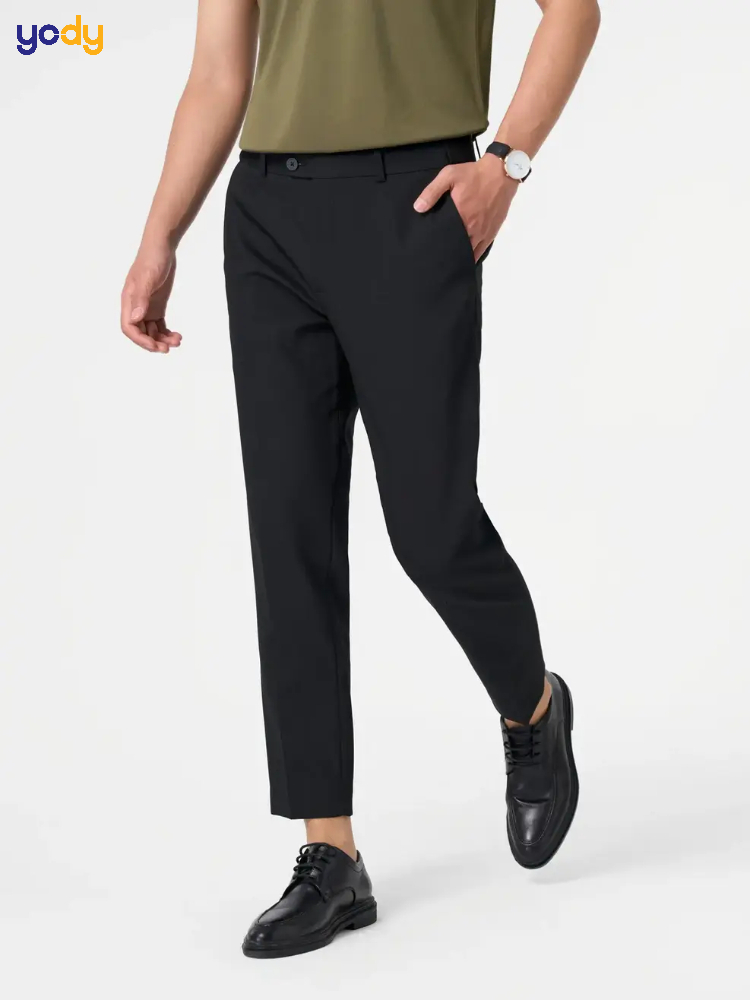 Thiết kế ôm gọn tôn dáng: Quần âu nam slimfit có phom dáng ôm nhẹ theo đường chân, tạo hiệu ứng làm chân dài và thon gọn hơn. Kiểu dáng này giúp người mặc trông cao ráo, cân đối mà không bị gò bó, đặc biệt phù hợp với những ai có thân hình từ trung bình đến cân đối.