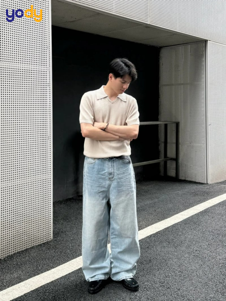 Sự kết hợp giữa áo Polo và quần jean thụng là minh chứng cho việc phong cách thanh lịch hoàn toàn có thể đi đôi với sự phóng khoáng. Thay vì vẻ ngoài cứng nhắc khi phối cùng quần tây, áo Polo khi đi cùng quần jean ống rộng mang lại một luồng gió mới, trẻ trung và thời thượng hơn. Đây là bộ trang phục "cứu cánh" cho những quý ông muốn giữ vẻ lịch sự trong các buổi họp mặt nhưng vẫn không muốn đánh mất cá tính riêng.