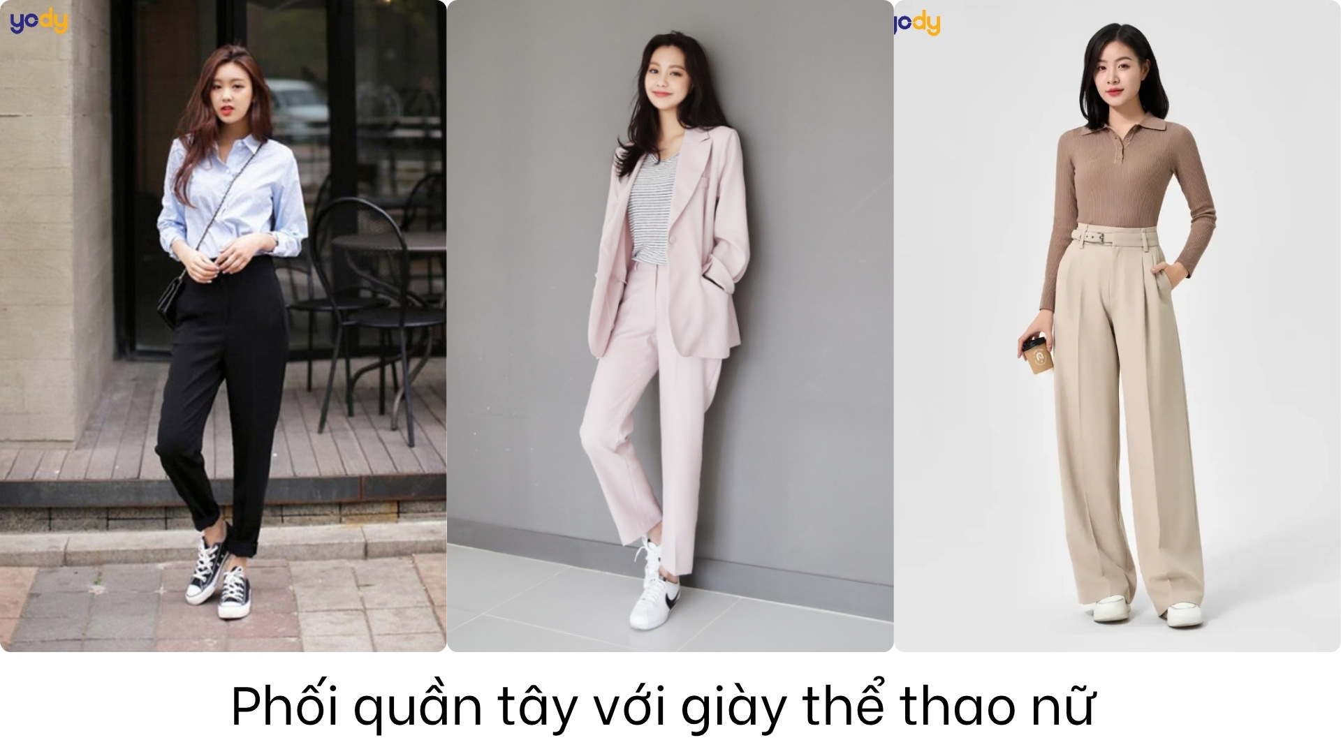 Phối quần tây với giày thể thao nữ là một xu hướng thời trang đang được nhiều chị em ưa chuộng. Sự kết hợp này không chỉ mang lại vẻ ngoài năng động, trẻ trung mà còn tạo cảm giác thoải mái cho người mặc. Dù bạn đang tìm kiếm một bộ trang phục cho công sở hay một buổi đi dạo phố, việc phối hợp giữa quần tây và giày thể thao nữ sẽ là lựa chọn hoàn hảo giúp bạn nổi bật và tự tin.