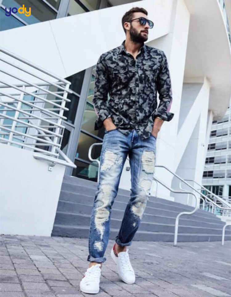 Nếu bạn muốn tạo phong cách năng động, trẻ trung mà vẫn giữ được nét thanh lịch thì đây là lựa chọn lý tưởng. Những họa tiết nhỏ như caro li ti, chấm bi, sọc nhỏ không quá nổi bật nhưng đủ để làm điểm nhấn cho trang phục. Quần jeans sáng màu sẽ cân bằng lại sự tinh tế của sơ mi, mang đến tổng thể hài hòa. Cách phối này đặc biệt phù hợp với nam giới trong độ tuổi từ 20 đến 35, thích phong cách casual hiện đại. Phụ kiện gợi ý gồm kính râm, đồng hồ thể thao và giày slip-on.