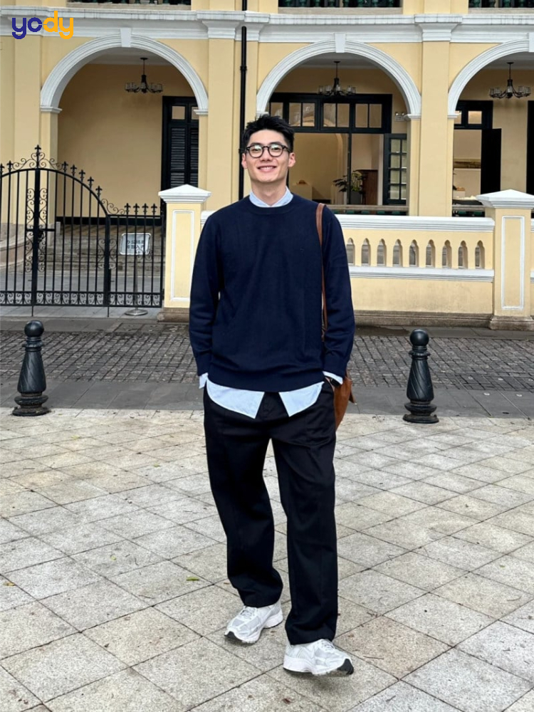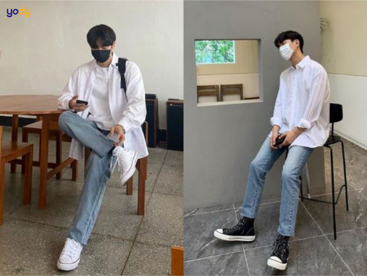 Đây là phong cách được yêu thích bởi những bạn nam theo đuổi gu thời trang Hàn Quốc – nhẹ nhàng, tối giản và tinh tế. Sơ mi form rộng mang lại cảm giác thoải mái, không gò bó, phù hợp với mọi vóc dáng. Khi phối cùng quần ống suông, trang phục trở nên thanh thoát, hiện đại mà vẫn gọn gàng. Bạn nên sơ vin nhẹ để tạo điểm nhấn vòng eo, kết hợp với giày thể thao trắng hoặc giày loafer sẽ rất hài hòa. Phong cách này phù hợp khi đi làm ở môi trường trẻ, đi chơi hoặc hẹn hò nhẹ nhàng.