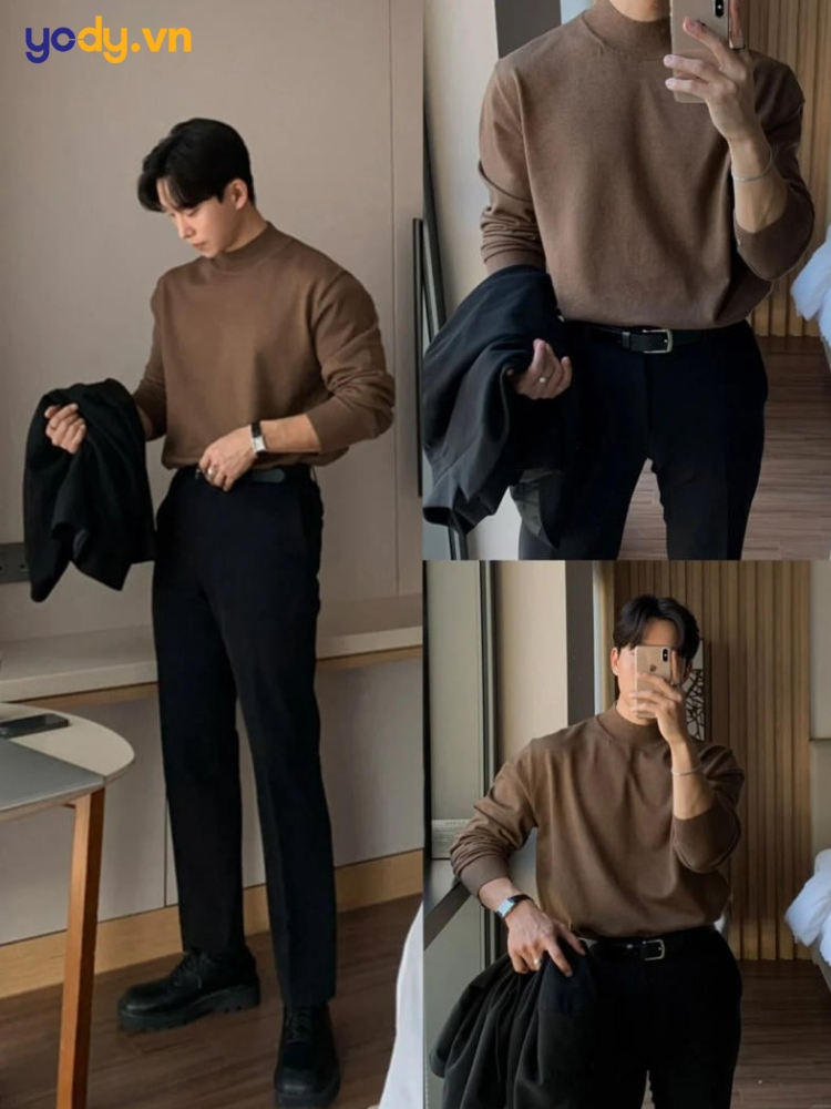 Một lựa chọn tinh tế cho mùa thu đông. Áo len cổ tròn (crewneck), cổ tim (V-neck) hay đặc biệt là áo len cổ lọ (turtleneck) khi kết hợp với quần âu ống đứng sẽ mang lại một vẻ ngoài tri thức, sang trọng và vô cùng cuốn hút.