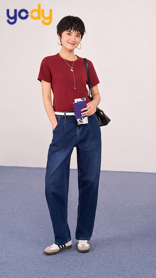 “Hack dáng” cho người thấp: Nếu bạn có chiều cao khiêm tốn, quần jean form rộng vẫn hoàn toàn phù hợp, chỉ cần chọn đúng kiểu. Hãy ưu tiên quần cạp cao để kéo dài phần thân dưới, ống suông vừa phải và độ dài chạm mắt cá chân để tránh bị nuốt dáng. Tránh xa những thiết kế quá dài hoặc quá rộng vì dễ khiến tổng thể trở nên luộm thuộm. Kết hợp cùng giày cao gót mũi nhọn hoặc sneaker đế độn sẽ giúp bạn ăn gian chiều cao một cách tinh tế.
